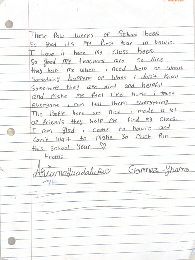 These few weeks of school have been so good! It’s my first year at Bowie. I love it here. My class has been so good, and my teachers are so nice. They help me when I need help or when something happens or when I don’t know something. They are kind and helpful and make me feel like home. I trust everyone; I can tell them everything.